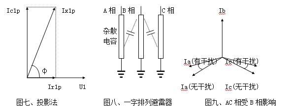現(xiàn)場(chǎng)測(cè)量時(shí),一字排列的避雷器(圖八),中間B相通過(guò)雜散電容對(duì)AC泄漏電流產(chǎn)生影響,使A相φ減小,阻性電流增大,C相φ增大,阻性電流減小甚至為負(fù),這種現(xiàn)象稱相間干擾(圖九)。